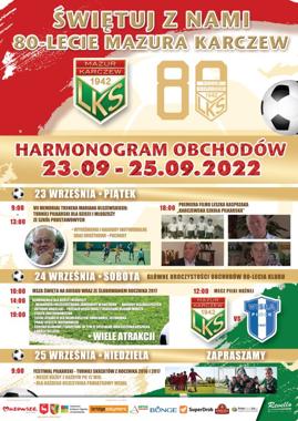 Uroczyste obchody Jubileuszu rozpoczną się w piątek 23 września 2022 r. memoriałem piłkarskim dla szkół podstawowych z powiatu otwockiego. Po południu, o godz. 18.00 odbędzie się premiera filmu Karczewska Szkoła Piłkarska. Jest to film dokumentalny, w którym byli piłkarze, działacze, trenerzy, będą opowiadać o historii Mazura Karczew.