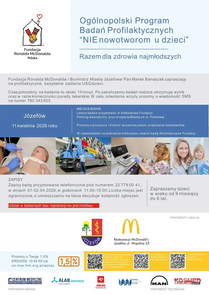 Program „NIE nowotworom u dzieci” w Józefowie jest współfinansowany przez Fundację Ronalda McDonalda i Miasto Józefów. Dla mieszkańców to prosta, konkretna pomoc: bez opłat, bez skierowania, ale z ograniczoną liczbą miejsc i z wymogiem punktualności. W takich akcjach liczy się nie tylko sam ambulans, lecz także to, że badanie można zrobić blisko domu, zanim problem urośnie do rangi poważnego kłopotu.