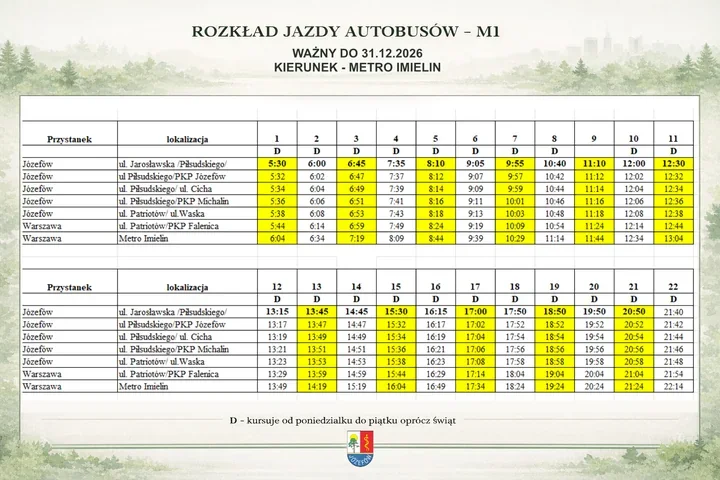 W komunikacie pojawia się też dobra wiadomość dla osób z józefowskim biletem metropolitalnym. Linia M1, podobnie jak K51, W50, I1 oraz I2, ma być dla nich bezpłatna także na odcinkach warszawskich. To oznacza, że jedna karta ma wystarczyć nie tylko na dojazd do granicy miasta, ale też dalej, aż do metra.
