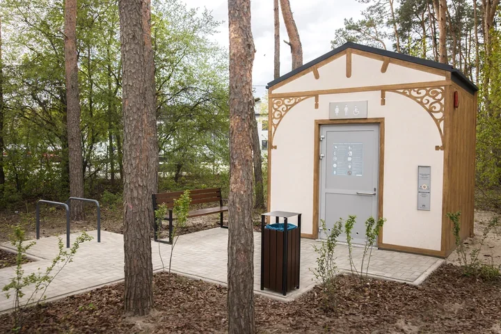 Nowa toaleta publiczna została wykonana w technologii prefabrykatu, a jej wygląd nawiązuje do tradycyjnej, drewnianej zabudowy kojarzonej z Otwockiem. To ważne, bo w tej części miasta liczy się nie tylko funkcja, ale też to, by nowy element nie zaburzał spokojnego, zielonego charakteru okolicy.
